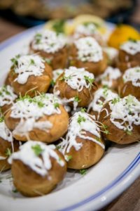 A tetejére vagy a saját krémjét nyomjuk, vagy natúr joghurtból és mascarponéból csinálunk egy semleges ízű öntetet. A töltelékhez illő zöldfűszerrel megszórjuk.