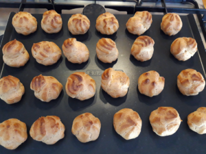 - A tésztát nyomózsákba töltjük és tapadásmentes sütőlapra vagy sütőpapírra diónyi halmokat nyomunk. (Megj: bár a nyomózsákhoz a kerek nyílású csőrt ajánlották hogy sima legyen a gömböcök felülete, az nekem szinte azonnal eldugult. Ezért a zsákból kikanalazva kiskanállal adagoltam a tésztát a sütőlapra és teljesen rendben volt így is. A képen látható adag a legnagyobb csillagcsőrrel készült. Ha nem zavar, hogy kicsit bordás, akkor százszor gyorsabb így. Arra még ügyelj, hogy a tojások hozzáadása és a sütés közt ne teljen el sok idő, ezzel lehet még elszúrni!