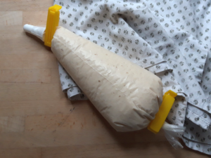 Ennek tulajdonképp nincs konkrét receptje, csak a hozzávetőleges mennyiségeket soroltam fel. A fantáziád szab csak határt és elrontani nehéz, hisz folyamatosan lehet kóstolgatni amíg tökéletesnek nem találod. Én a krémsajtot/túrót részben mascarponéval helyettesítettem a krémes állag és lágyabb íz érdekében. A lényeg, hogy egy nem túl folyós-nem túl kemény krémet állíts össze, aminek az ízesítése illik a töltéshez kiválasztott “maghoz”. Ha elégedett vagy az ízével, akkor töltsd habzsákba. Most már elég lesz a kisebb lyukú csillagcső is. A képen látod, hogy én praktikusan egy zacskózárót teszek az elejére amíg töltöm, hogy ne folyjon ki, és azzal is zárom le, mert így könnyebb nyomni belőle a töltésnél.